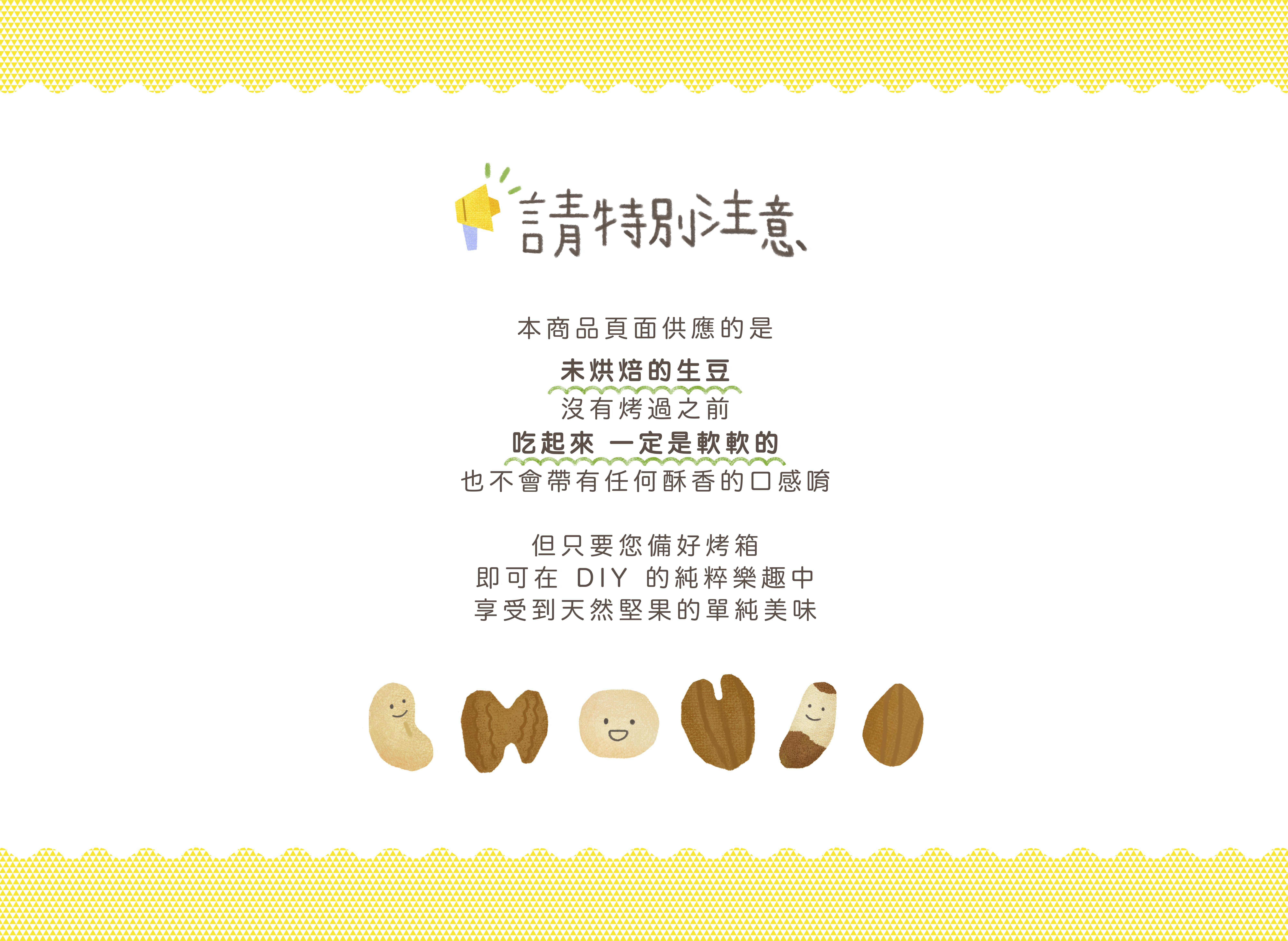 ❶ 生堅果未經烘焙來烤乾天然果實內帶有的水份,因此如果沒有烘烤直接食用,吃起來一定是軟的也沒有香氣哦!