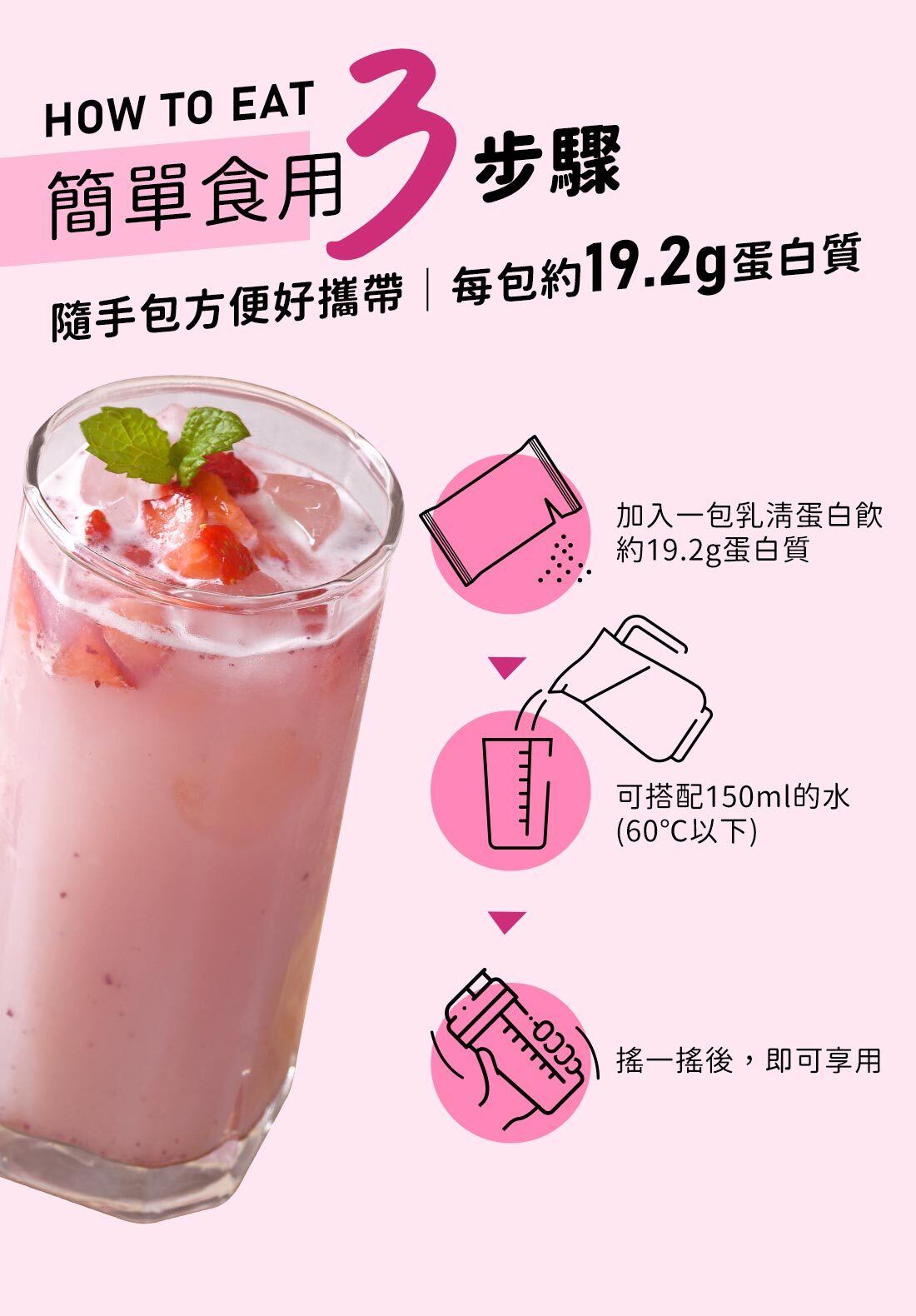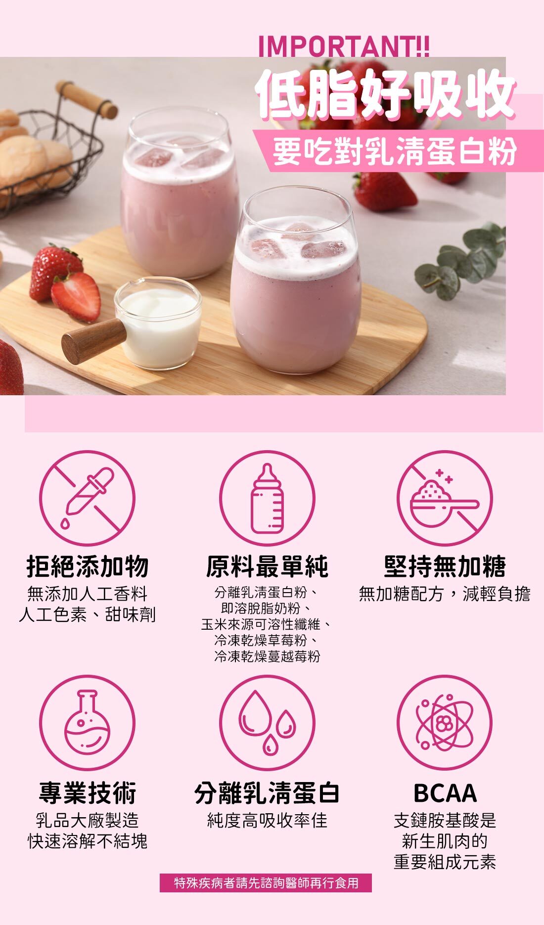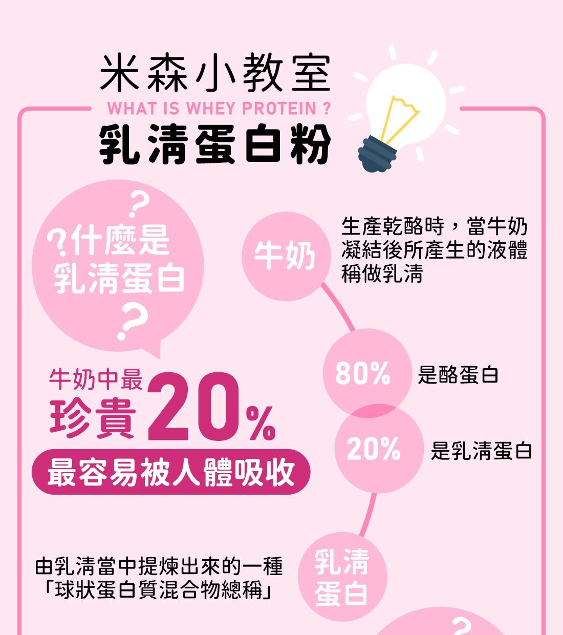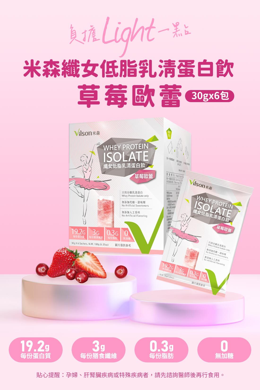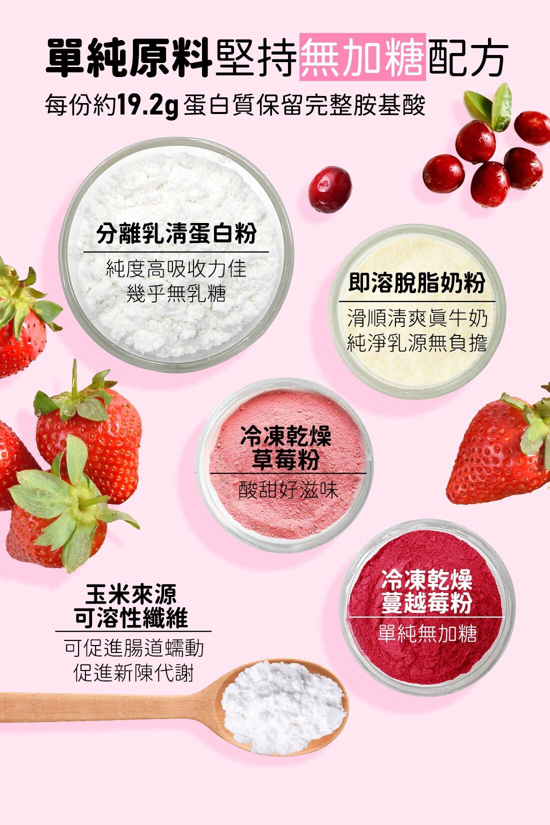 乳製品大廠製造的分離乳清蛋白粉,並搭配米森特選即溶脫脂奶粉、冷凍乾燥草莓粉及蔓越莓粉,玉米來源可溶性纖維,可促進腸道蠕動,酸甜風味讓您更好入口,堅持無加糖、無化學調味,每份蛋白質達19.2公克,是重訓者的最佳補充品,可依照不同族群者一日所需蛋白質攝取,隨手包設計攜帶方便,讓您隨時可補充蛋白質。